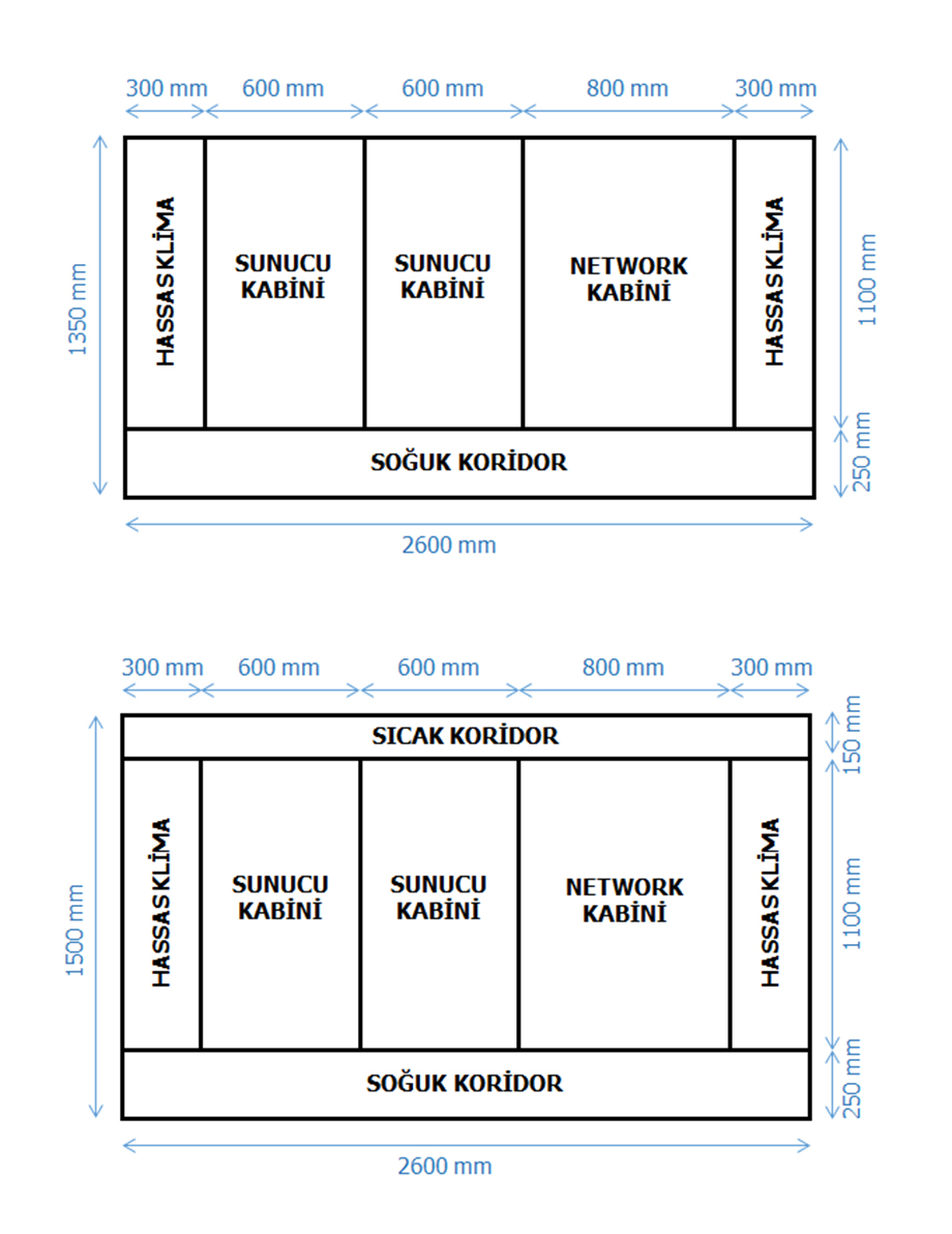 Mikro Veri Merkezini eğer ofis ortamına ve çalışma alanı içerisine yerleştiriyor iseniz sisteminizde ısı ve ses izolasyonu için hem soğuk hem de sıcak koridora ihtiyacınız olacaktır. Bu durumda kabinlerden çıkan sıcak hava kapalı sıcak koridor içinde kalacak ve hassas klimalardan çekilerek soğutulup yeniden kapalı soğuk koridora verilecektir. Bu durumda sistem derinliği kabin içi çalışma alanı derinlikleri de dikkate alınarak 1500~1600 mm olacaktır.